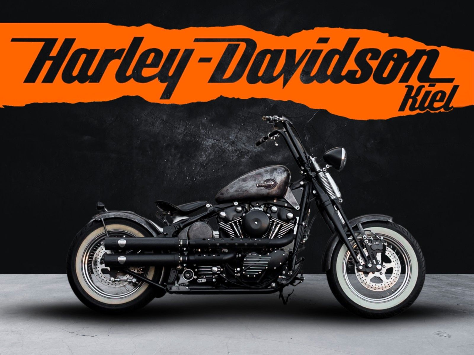Ein ikonisches Cruiser-Motorrad mit dem charakteristischen Erscheinungsbild, einem 96 CUI (1584 cm³) Twin Cam Motor, Sechsgang-Getriebe und dank Vergaserumbau mit dem typischen Harley Sound. Hier als einzigartiger Custom Umbau im Old School Bobber Gewand mit Springergabel.